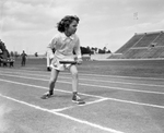 Judy Tillery, of South High Mount, awaits start of her respective race at the elementary relays at Farrington Field. Judy, age 9, competed in Class E. Published in Fort Worth Star-Telegram morning edition April 30, 1952.