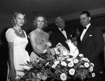 Mrs. J. H. Snowden, left, and Mrs. William M. Fuller, distinguished guests and hospitability chairmen for the Opera Guild of Fort Worth's reception at River Crest Country Club honoring the cast of "Faust," put the finishing touches on a table arrangement. With them are their husbands, Mr. Fuller, left and Mr. Snowden.