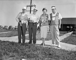 Left to right, J. D. Verner, Murray Woody, Mrs. Dee Moncrief, and Harry Tennison are among city marksman compete in Louisiana State Trap shoot at Shreveport. The four people are standing holding guns. Published in Fort Worth Star-Telegram evening edition May 1, 1952.