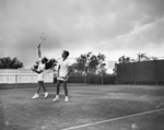 James Wilson smashes a forehand return against Miami in Number 1 doubles as Teammate Charles Ludwig looks on. Wilson and Ludwig bested Frank Keister and Sam Wright, 6-0, 6-2, for frogs' lone victory as Miami won practice match, 6-1. Published in Fort Worth Star-Telegram evening edition May 2, 1952.