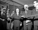 Mayor Edwards, right, cuts the ribbon and formally opens the new Bond store in the Oil & Gas Building, 7th and Taylor. Barney Ruben, president and board chairman of Bond Stores, Incorporation is standing near him. Published in Fort Worth Star-Telegram evening edition May 1, 1952.