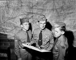 Darrell Sutherland, left, and Jimmy Ables, right, confer with their Boy Scout adviser, Wilbur Holmes on Operation Horned Frog. They are working on recruiting blood donors for the North Texas National Defense Blood Center. Published in Fort Worth Star-Telegram morning edition May 2, 1952.