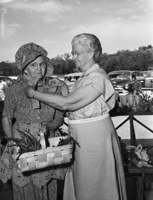 Mrs. Frank Estill, left, of Bedford, tries on a bonnet for size before swapping her flowers with Mrs. G. C. Fugate of Birdville at the Tarrant County annual Home Demonstation Club "swap day" in Rockwood Park.