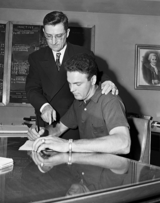 John Reeves, left and Frank Marchio, right are shown signing the contract in the photograph. Published in Fort Worth Star-Telegram evening edition, May 05, 1952.