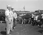 Steers in the Spur feed tests were marketed in Fort Worth, where they were among the day's best receipts, the 70 head bringing 34.50 cents a pound. Pictured here in the Stockyards pen are, left to right, Harry Ellis of the Spur station; Paul Marion, station animal husbandman in charge of the tests, and buyer, A. L. Long of Neuhoff Packing Co., Dallas.