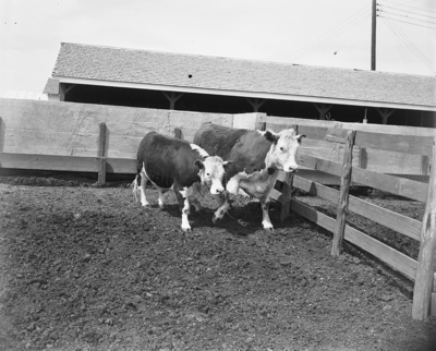 Striking contrast between the stocky, compact type steer that gained popularity in recent years and the rangy, largeframe type is shown in this picture in the Spur testing pens. The smaller steer weighed 800 pounds, dressed out 61.2 percent and was graded choice. The larger weighed about 300 pounds more than the smaller one, dressed 64.4 percent and also graded choice. The station got $103.50 more for the larger one.