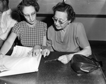 Shivers Win in County Box - Precinct 42, which includes Birdville, Oak Knoll and Haltom City, was one pf Tarrant County's first democratic precincts Saturday to favor uninstructed vote at count's first courthouse- Birdville School-45 delegates defeated "loyalist" efforts to name a permanent chairman and "loyalist" delegates, also a proposal for a written loyalty oath. Miss Phyllis Ellis, 2919 Haltom Road, left, and Miss Eula Lee Carter, same address, checked exemptions and poll taxes.
