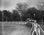 Typical scene at the fifth annual Ridglea Hills Hunter and Jumper. This photo show Miss Gay Gooch, daughter of Mr. and Mrs. J. A. Gooch, Fort Worth, on her Palomino registered Quarter horse as she takes a jump in the Green Hunter stake.