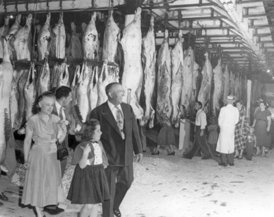 Visitors walk through Armour & Company's big meat cooler during open house for the company's 50th anniversary, 05/05/1952