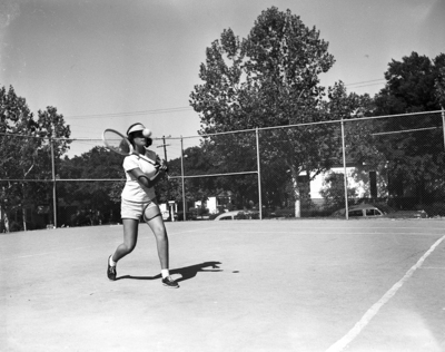 Barbara Locke of Oakhurst makes forehand return en route to girls' singles title in elementary tennis tournament. She beat Lee Ann Campbell of Alice Carlson, 4-3, 4-1, in finals. Published in Fort Worth Star-Telegram evening edition May 8, 1952.
