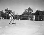 Richard Johnson, left, of Oaklawn makes two-fisted return in elementary tennis tournament. Published in Fort Worth Star-Telegram evening edition May 7, 1952.