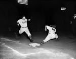 Beaumont's Al Pilarcik speeds to first as Cats first baseman Wayne Belardi reaches for throw from Jack Lindsey in sixth inning. Umpire Bob Smith's "safe" call brought on heated argument. Published in Fort Worth Star-Telegram evening edition, May 07, 1952.