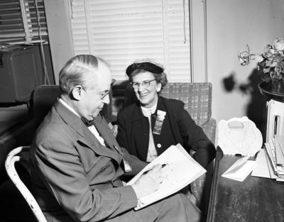 Karl Kae Knecht, newspaper cartoonist and president of the Circus Fans Association, sketches an elephant for his wife.
