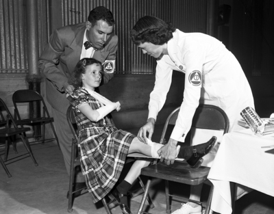Mrs. Ila Rockett, nurse at Harris Hospital, sets the "broken" leg of Janice Hoover, daughter of Mr. and Mrs. H. Hoover. Janice was one of the "victims" treated Wednesday night during the defense demonstration. Another volnteer defense worker, Harry King, ambulance, assists the nurse.