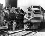 Henry Hassell, oldest machinist at Fort Worth's Texas & Pacific Railway Lancaster train shops, stands by the first type of steam locomotive which sits next to a new diesel locomotive, 05/08/1952
