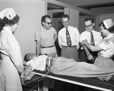 The Star-Telegram Employes Association sponsored a Star-Telegram-WBAP day at the Blood Center. On the table is Curley Broyles of WBAP. Standing are Bob Hilburn, courthouse reporter; A. G. McDaniel, WBAP-TV commercial department, and Bill Fairley, advertising department. The nurse is Mrs. Cooter Barnett, the nurses aide is Mrs. Venita Butler.