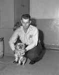 Patrolman W. K., Moore crouching on the floor and holding the Pekingese dog. They are waiting for her owners to be released from jail.