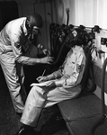 Master Sergeant Robert H. Fletcher, right, re-enacts for the camera what happened when he blacked out at 40,000 feet because of lack of oxygen during a demonstration of the effects of hypoxia - lack of oxygen. With him is Airman 1/c Vernon B. Teems, who saved Fletcher's life when he plugged in his oxygen mask.