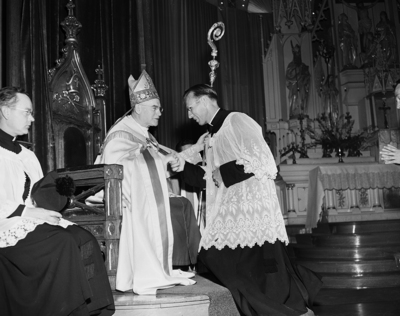 Bishop Thomas K. Gorman receives the obedience of Reverend Robert Lazzari, O. S. B. principal of Laneri High School, from his episcopal throne in the Cathedral of the Sacred Heart in Dallas. Bishop Gorman is holding the crozier, symbol of the new coadjutor-bishop's authority. Published in Fort Worth Star-Telegram morning edition May 9, 1952.