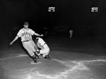 Shreveport's Joe Szekley crashes into Cats' Ted Bosaick and jars ball loose to score in sixth inning. Throw came from Odbert Hamric in center field after Joe Koppe flied out. Published in Fort Worth Star-Telegram evening edition, May 09, 1952.