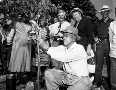 County Agent Jack McCullough shows how to make a cut on a young pecan tree for inserting a bud from a more desirable variety. The photo was taken at a demonstration at the C. G. McCord home, 5029 Hampshire, Fort Worth. The image shows Jack McCullough crouched near a pecan tree with a crowd. Published in Fort Worth Star-Telegram morning edition May 14, 1952
