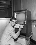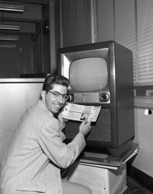 After several false starts, the STEA governors finally got around to giving away the TV set, and Joe Titus, night police reporter, won. Sad to see was June Tipton, who was first announced as the winner, but whose card was Red 42, not the winning Red 2. Joe didn't have a TV set, either. Titus is kneeling in front of the television set, and holding a card.