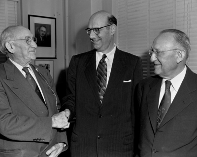 Dan Danciger, left, and A. Danciger, right, Fort Worth oil men, get a "thank you" from David Goitein, center, Israel's minister to the United States, for the heavy investment the Fort Worth men have made in Israel's bond issue. Goitein said the fund would be used to open new roads, build new channels for the River Jordan, construct air fields and develop agriculture and soil. Published in the Fort Worth Star-Telegram, May 10, 1952.