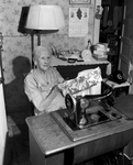 Mrs. R. P. Glenn, who will celebrate her 92nd birthday Thursday, snips a seam that she's just stitched on the new sewing machine she recently purchased. Published in Fort Worth Star-Telegram evening edition May 9, 1952.