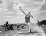 Clarence Darrow Hooper performing shot put for Texas A&M University (T. A. M. U.) in a Southwest Conference track meet.