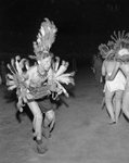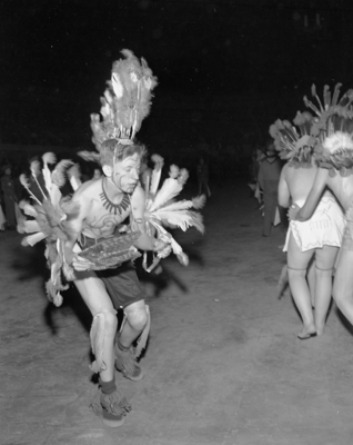 Clipping reads: "Boys will be boys -- More than 7,000 Scouts gave their best at Will Rogers Memorial Coliseum for the 14th annual Boy Scout Circus. Medicine Man Richard Laboon, center, of Post 2016, whoops it up and brews good medicine for his tribe. A boy wearing feathers on his head and arms doing a dance." Published in the Fort Worth Star-Telegram on Sunday, May 11, 1952.