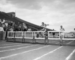 120-yard high hurdles finals. Shown are (left to right): Val Joe Walker from Southern Methodist University; James Blake from Texas A&M; and Willie Walls from Texas University.