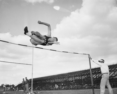 Walter (Buddy) Davis of Texas A&M clears the bar at 6ft and 10.5 inches. He is shown in midair as he clears the bar.