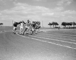 Sprinters in the 440-yard relay at the Southwest Conference track meet make the final baton exchange a smooth operation as the anchor men take over and head for the stretch. Left to right are D. L. Yoder, Arkansas; Jim Brownhill, Texas; Charles Thomas, Texas ; James Heflin, Rice; Buddy Goode, Southern Methodist University, and Bill Stalter, Texas A&M. The Longhorns won the event in a tight finish, with Southern Methodist University second and the Rice Owls third. The winning time was 41.0. Published in Fort Worth Star-Telegram morning edition May 11, 1952.
