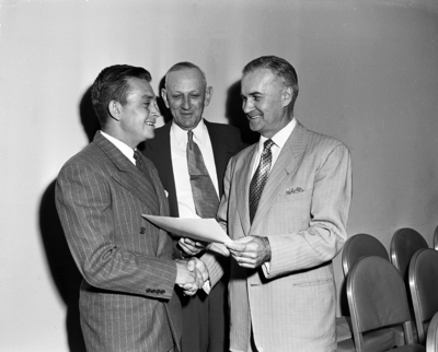 Victor F. Maddox Jr., left, outstanding building trades apprentice, is shown receiving his certificate from Travis J. Lewis, right, regional director of the bureau of apprenticeship, at the Hilton Hotel. Watching the presentation is Scott J. McGinnis, apprentice representative for the bureau in Fort Worth. Published in Fort Worth Star-Telegram morning edition May 11, 1952