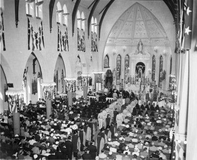 Fort Worth Catholics make obedience to Bishop Thomas K. Gorman at military mass, Saint Patrick's Cathedral; at Bishop Gorman's left is Father Vernon Bordelon, chaplain at Carswell Air Force Base, 05/11/1952