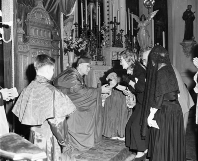Most Rev. Thomas Gorman of Dallas receives Mrs. Catherine Lehane, 93, one of oldest members of Saint Patrick's church, during solemn military mass; assisting Mrs. Lehane is pastor of Saint Patrick's, Msgr. Joseph G. O'Donohoe; Mrs. Nenetta B. Carter on far right, 05/11/1952