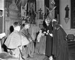 Most Rev. Thomas Gorman of Dallas receives Mrs. Catherine Lehane, 93, one of oldest members of Saint Patrick's church, during solemn military mass; assisting Mrs. Lehane is pastor of Saint Patrick's, Msgr. Joseph G. O'Donohoe; Mrs. Nenetta B. Carter on far right, 05/11/1952