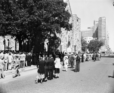 Crowd outside Saint Patrick's Catholic Church, Throckmorton Street, Fort Worth, to see Bishop Thomas K. Gorman, new coadjutor bishop of Dallas diocese, 05/11/1952
