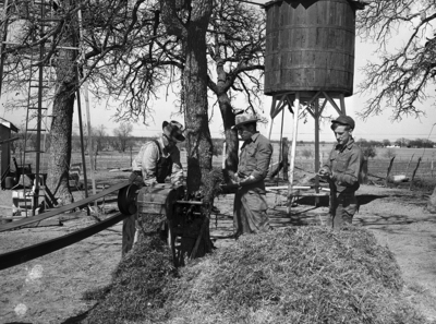 Cullen Rogers, left, pushes Bermuda grass through an old silage cutter to make two-inch sprigs which will be planted on his new waterway. Handling the grass to Rogers is Kenneth Coan and keeping the grass damp is James Benson. Both are Soil Conservation Service technicians from De Leon. Published in the morning edition, March 29, 1950.
