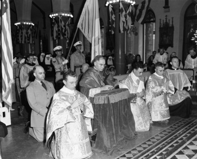 Saint Patrick's Catholic Church, Fort Worth, Bishop Thomas K. Gorman, new coadjutor bishop of Dallas diocese, celebrates military mass; from left, Chaplain Vernon Bordelon, Father Leonard Knoff, Bishop Gorman, Father DeFalco, Father Fintan Oldham, Father Carl Vogel, and Father Edwin Johnson, 05/11/1952