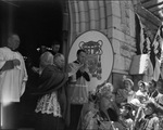 At front entrance to Saint Patrick's Catholic Church, Fort Worth, Bishop Thomas K. Gorman, new coadjutor bishop of Dallas diocese, blesses the crowd outside, 05/11/1952