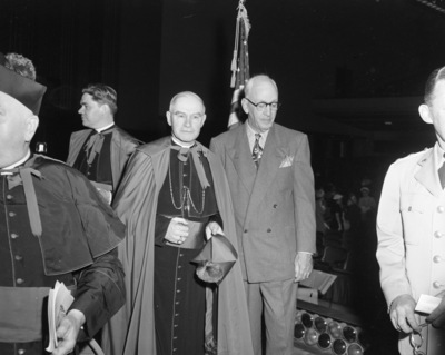 Saint Patrick's Catholic Church, Fort Worth, Bishop Thomas K. Gorman, new coadjutor bishop of Dallas diocese, with, from left, Msgr. O'Donohue, Msgr. John Gulczynski, and unidentified man, 05/11/1952