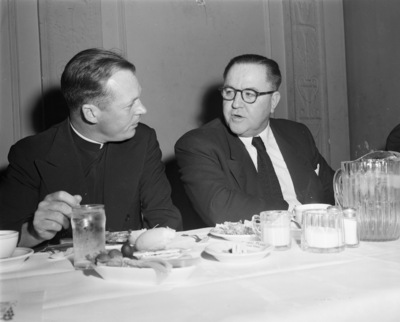 From left, Father Edwin Johnson with unidentified layman at the public banquet held for Bishop Thomas K. Gorman at Hotel Texas, Fort Worth, 05/11/1952