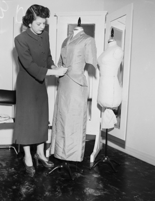 Dorothy Huff, 916 Conner Avenue, Texas State College for Women (TSCW) senior who won second place awards in both the 1948- 49 Star-Telegram Sewing Contests is carefully fitting her garment for entry in the 1950 contest. She is wearing the suit which won her second place in the 1949 "Make It Yourself With Wool and Mohair" contest sponsored by the Auxiliary to the Texas Sheep and Goat Raisers Association.