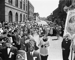 Crowd and procession outside Saint Patrick's Catholic Church, Throckmorton Street, Fort Worth; Bishop Thomas K. Gorman, new coadjutor bishop of Dallas diocese, is in center of photo. Members of the Knights of Peter Claver are seen leading in front of Bishop Gorman; 05/11/1952