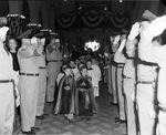 Members of the military escort from Carswell Air Force Base, are shown at attention in St. Patrick's Church as the procession enters for the solemn military mass in the presence of Bishop Thomas Gorman of Dallas. A portion of the procession of children of St. Ignatius Academy is headed by first graders Joseph Hayes, left, and Michael Buquoi, dressed in miniature monsignor's vestments; Mrs. Nenetta B. Carter at far left, 05/11/1952