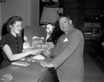Henry E. Swanson of West Buxton, Maine, was first to register for the third annual Hereford Congress at Hotel Texas. Miss Colleen Murphy, office secretary of the Texas Hereford Association, Fort Worth, took his registration card. A man wearing a suit smiling at the camera and woman wearing a dress looking down at the table giving something to the man. There is a cardboard image of a cow in center.