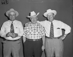 Left to right, N. M. Mitchell, Sanderson, president of the Texas Polled Hereford Association; Joe Reese, Crawford, secretary of the Central Texas Polled Hereford Association, and Perry Landrum, Waco, president of the Central Texas group. Three men with cowboy hats on their heads, and they are smiling.