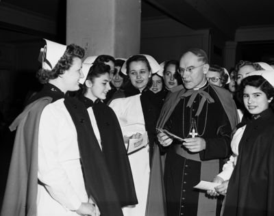 Nurses talking to Bishop Gorman are, left to right, Betty Massingill, Mary Roussey, Mary Gote, Genevieve Planeta. Published in Fort Worth Star-Telegram morning edition May 12, 1952.