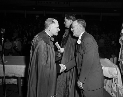 Judge Frank P. Culver congratulates Bishop Gorman at a civic reception at Will Rogers Auditorium. Marshall Space Grant Research John Gulczynski in background. Published in Fort Worth Star-Telegram morning edition May 12, 1952.